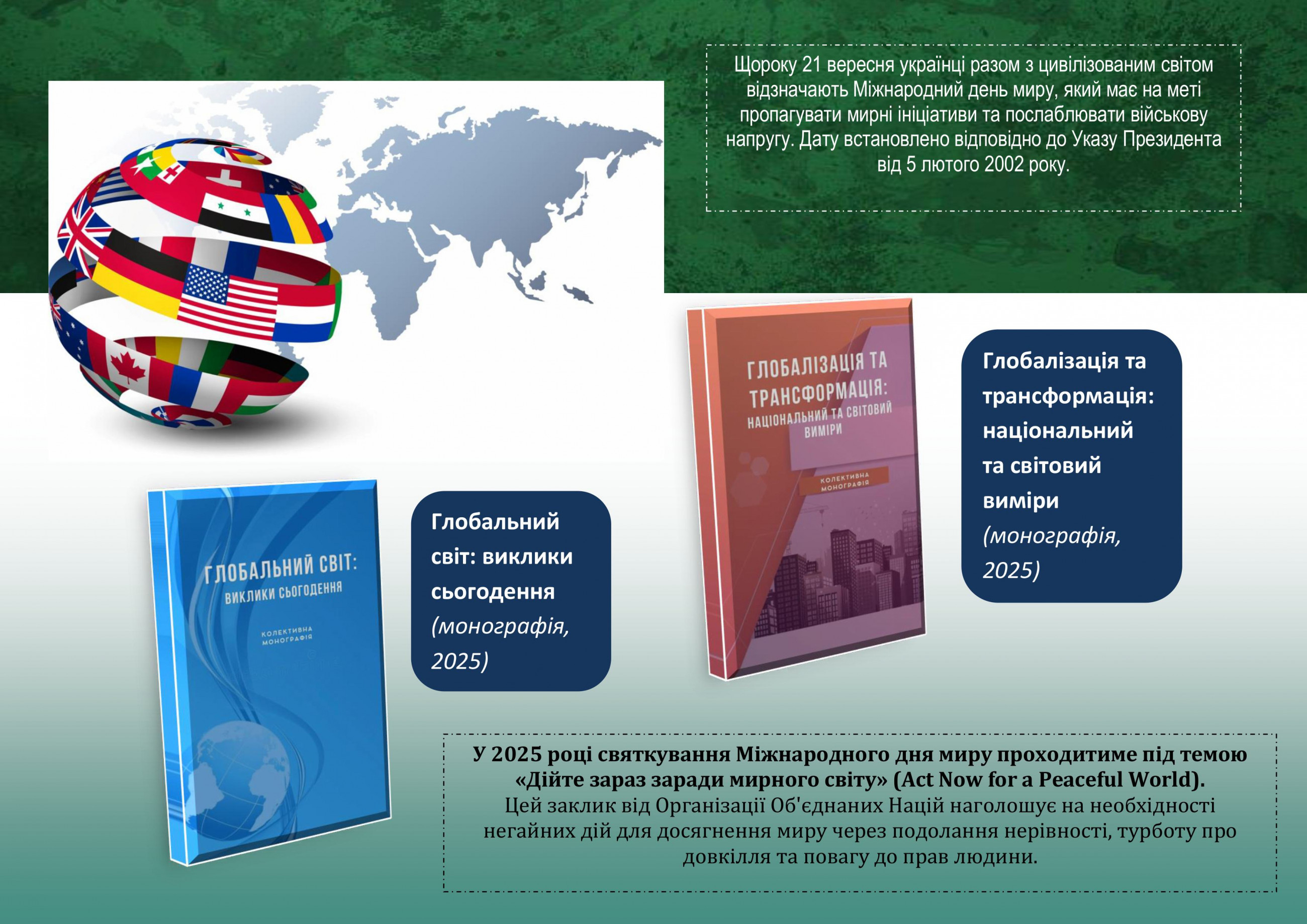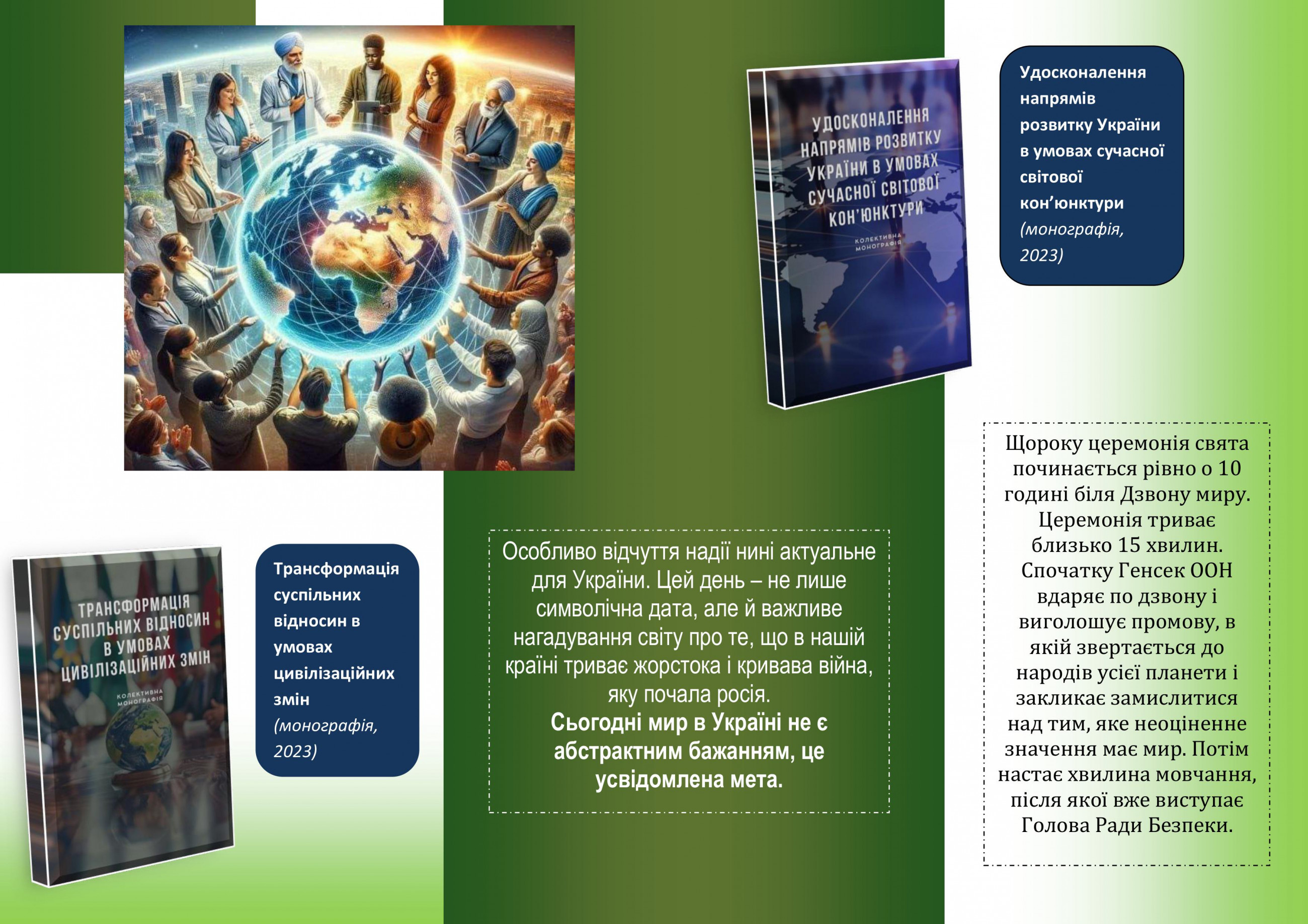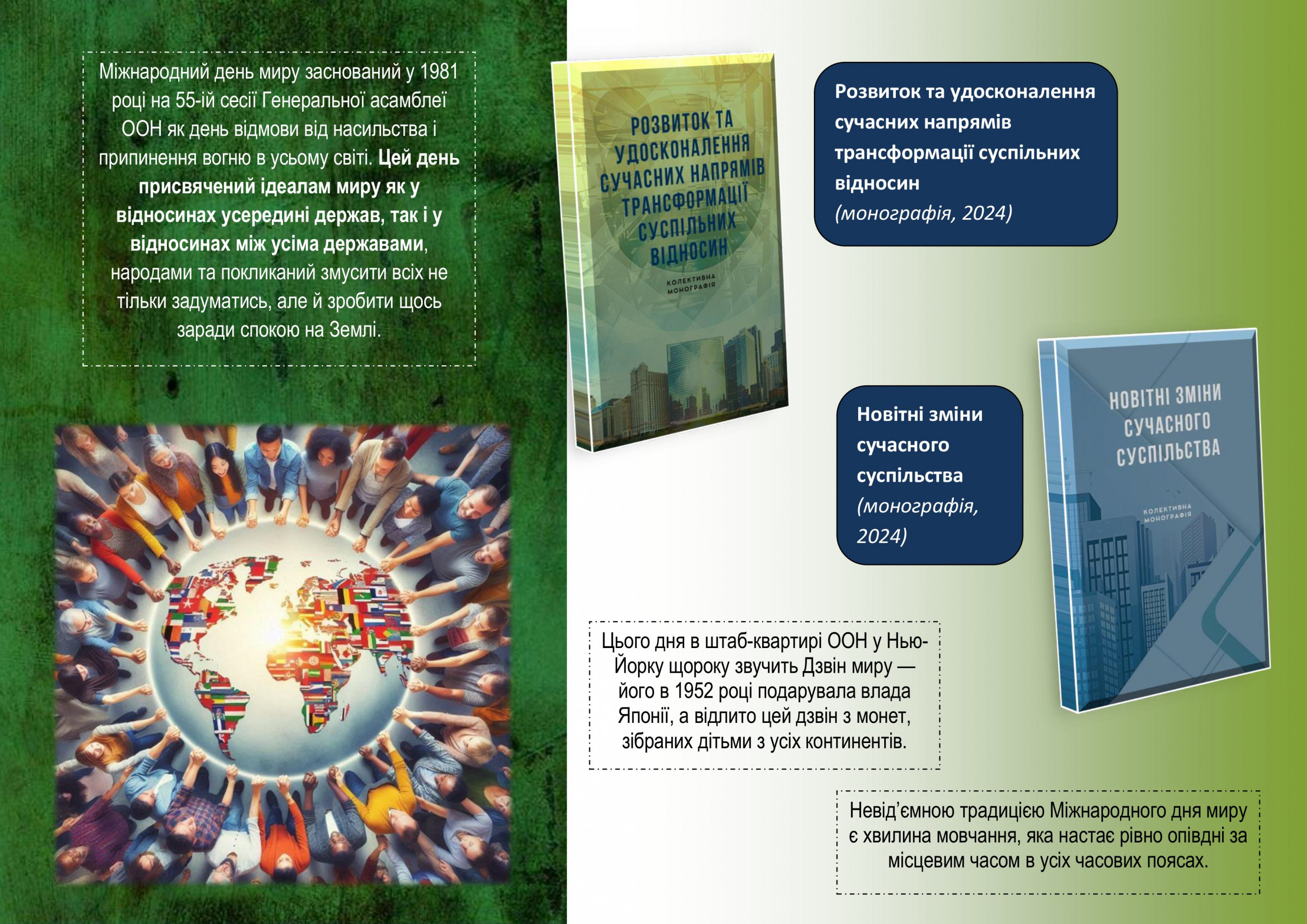 Книжкова виставка, представлена в бібліотеці, пропонує до ознайомлення монографічні видання, що розкривають тему миру, толерантності та спільної відповідальності за майбутнє. Книги на виставці нагадують про цінність миру в сучасних умовах, підкреслюють важливість діалогу, взаємопідтримки та людської гідності, зображають прагнення до миру та надію на світле майбутнє країни.