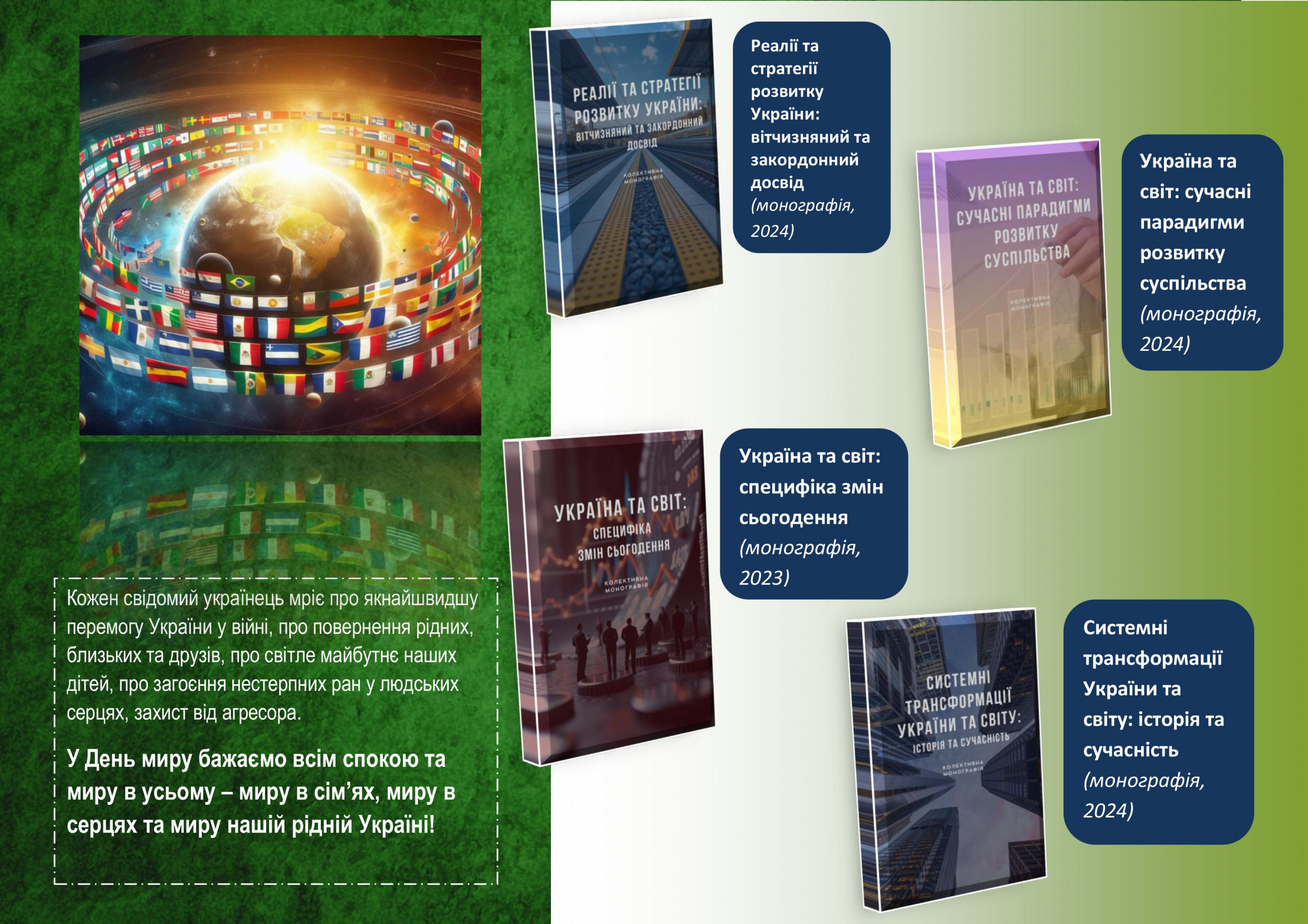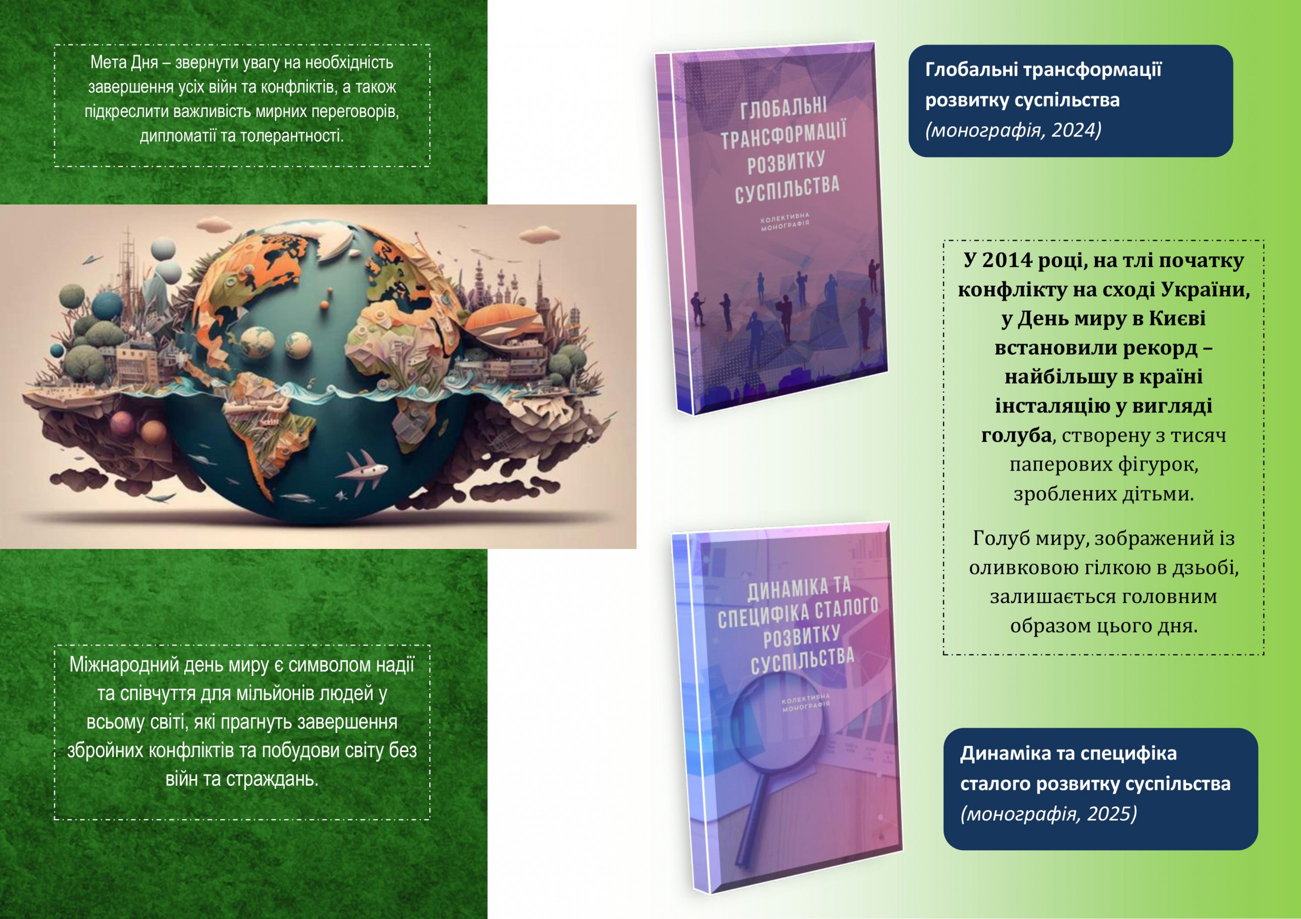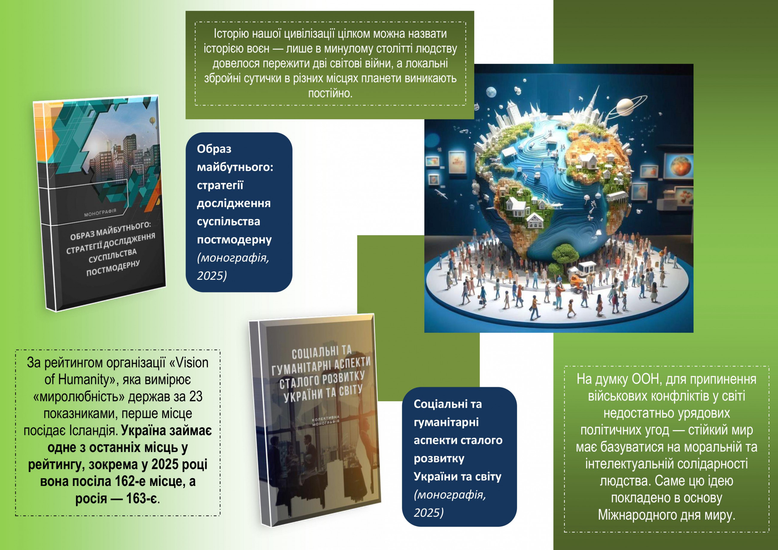 Книжкова виставка, представлена в бібліотеці, пропонує до ознайомлення монографічні видання, що розкривають тему миру, толерантності та спільної відповідальності за майбутнє. Книги на виставці нагадують про цінність миру в сучасних умовах, підкреслюють важливість діалогу, взаємопідтримки та людської гідності, зображають прагнення до миру та надію на світле майбутнє країни.