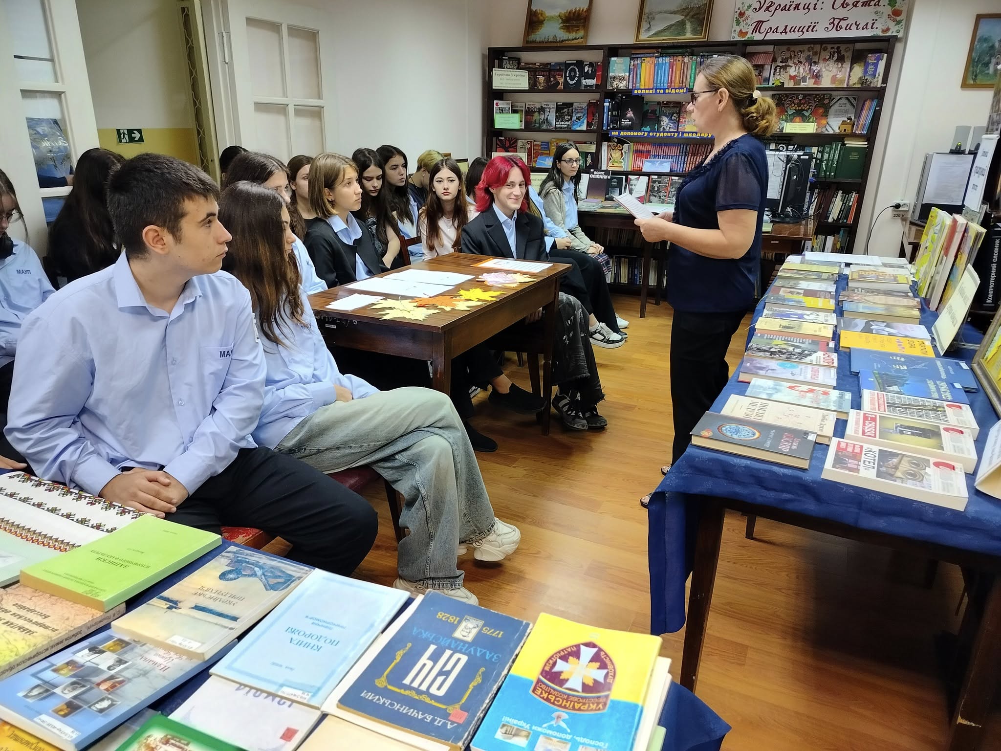 Працівники бібліотеки підготували тематичні виставки, а завідувачка С.П.Косійчук презентувала віртуальну екскурсію в історію сучасних українських бібліотек та розповіла про можливості електронних послуг. Згадали здобувачі освіти про історичні події нашого міста, про героїв-захисників.