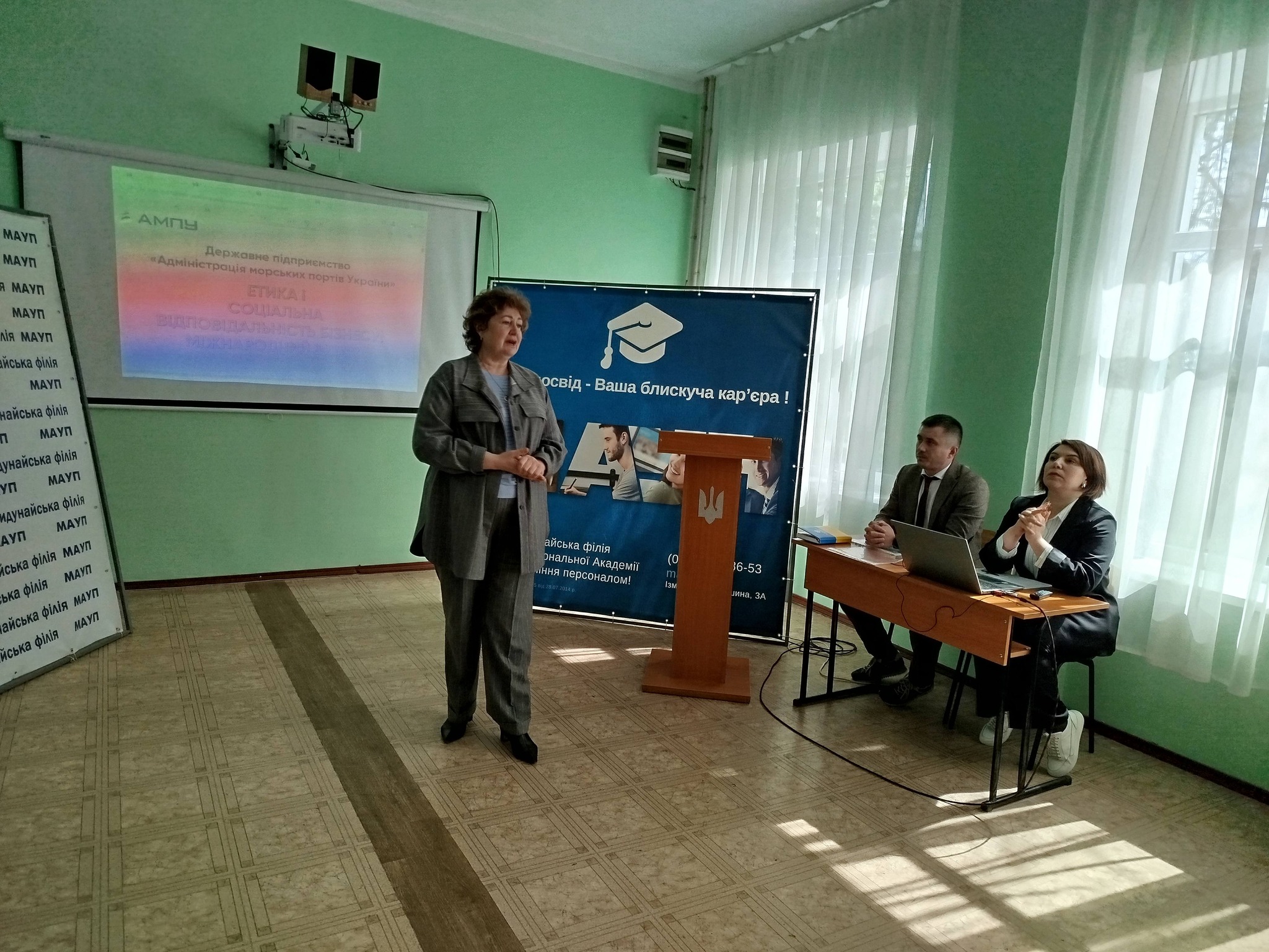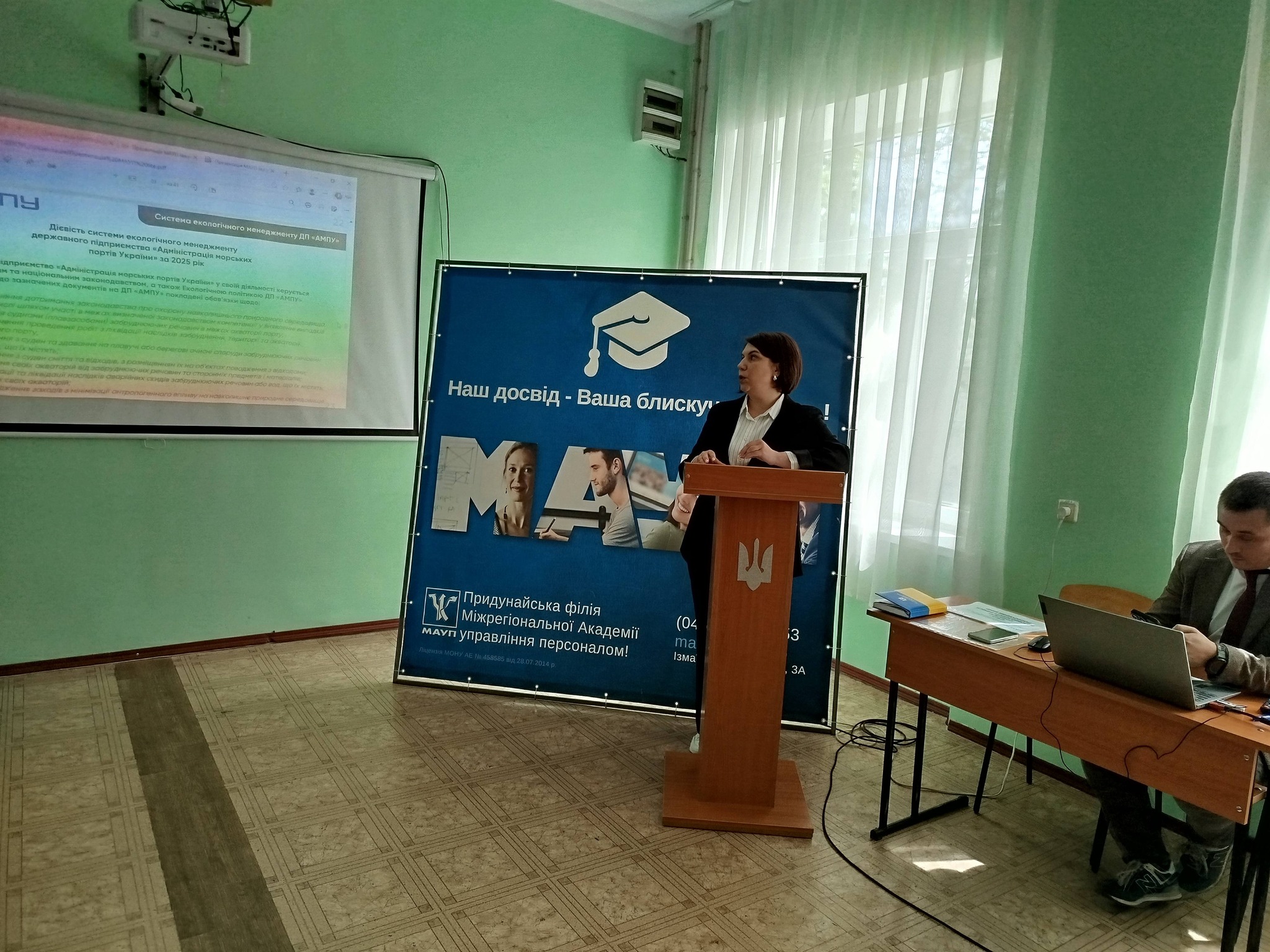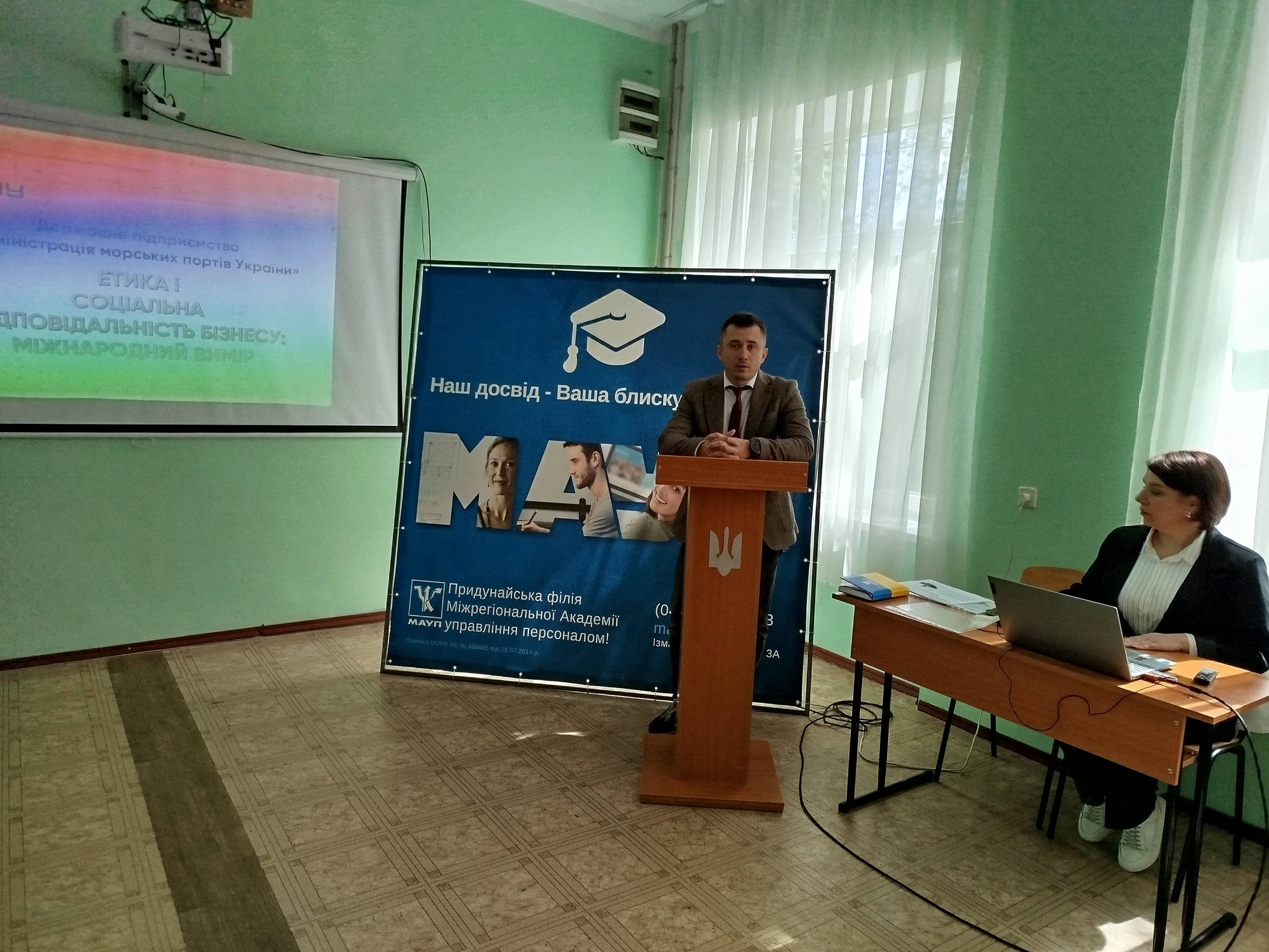 14 квітня 2026 року у Придунайській філії ПрАТ «ВНЗ «МАУП» відбувся круглий стіл із заступником начальника Ізмаїльської філії ДП «АМПУ» з операційної діяльності Ігнатенком Максимом Петровичем та фахівцем з публічних закупівель І категорії відділу з організації процедур закупівель та договірної роботи Ізмаїльської філії ДП «АМПУ» Сарлачан Наталією Валеріївною.