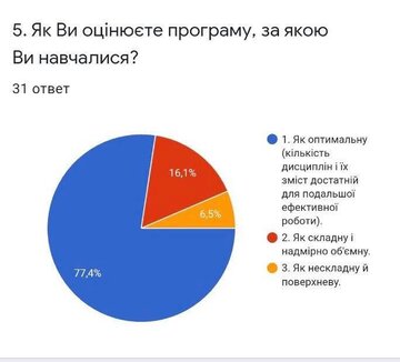 Студентська рада самоврядування Придунайськоі філіі МАУП підбила підсумки проведення опитування серед випускників філіі різних років щодо якості отриманих знань під час навчання. В опитуванні взяв участь 31 випускник. Ось як виглядають результати їхніх відповідей: навчанням в ПФ МАУП повністю задоволені 77,4% опитаних; цікавим навчання виявилося для 81,7%; як ґрунтовні й достатні отримані знання оцінюють 93,6%; 71% опитаних вважають, що знання стали їм у нагоді в подальшому житті та професійній діяльності; 77,4% оцінили програму навчання як оптимальну (кількість предметів та їхній зміст є достатніми для ефективної роботи); а ось впіввідношення теоретичних знань, що забезпечувалися практичними навичками, позитивно оцінили лише 56,7%, проте були задоволені проходженням навчальних виробничих практик 90,3%.