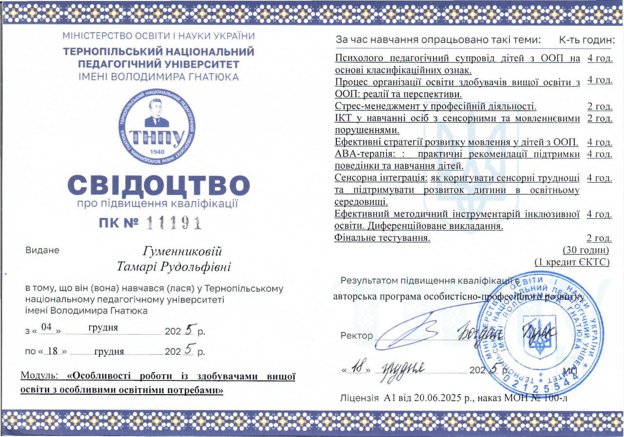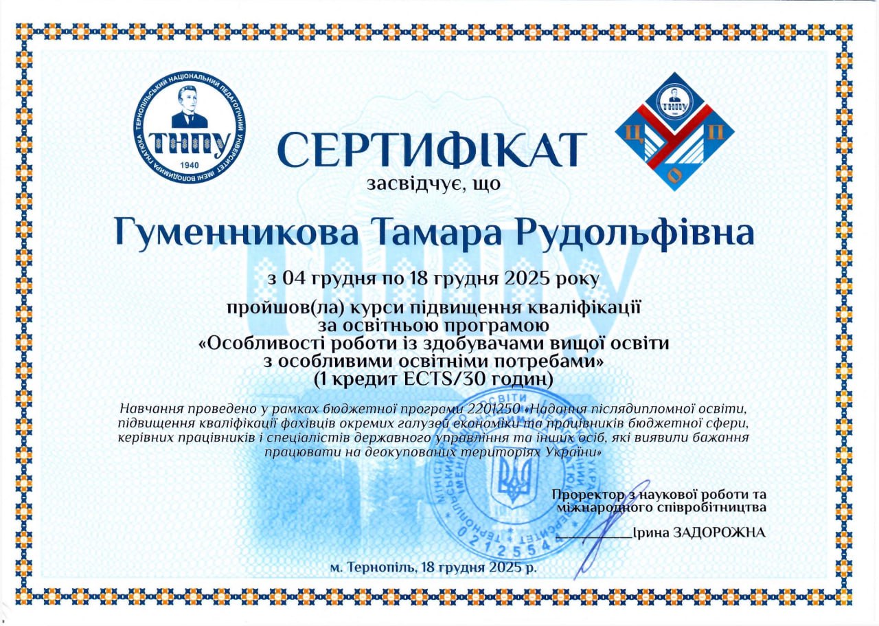 Сертифікат та свідоцтво про проходження курсу підвищення кваліфікації за освітньою програмою "Особливості роботи із здобувачами вищої освіти з особливими освітніми потребами" (Тернопільський національний педагогічний університет ім. В.Гнатюка) (30 годин - 1 кредит ЄКТС), 18.12.2025 р.
