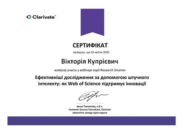 Сертифікат учасника всбінара серії Research Smarter "Ефективніші дослідження за допомогою штучного інтелекту: як Web of Science підтримує інновації" (Clarivate) (1 година), 25.04.2025 р.