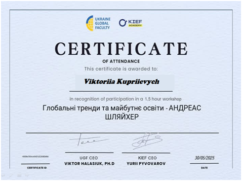Сертифікат учасника семінару "Глобальні тренди та майбутнє освіти - АНДРЕАС ШЛЯЙХЕР" (Ukraine Global Faculty; KIEF Academy), 30.05.2025 р.