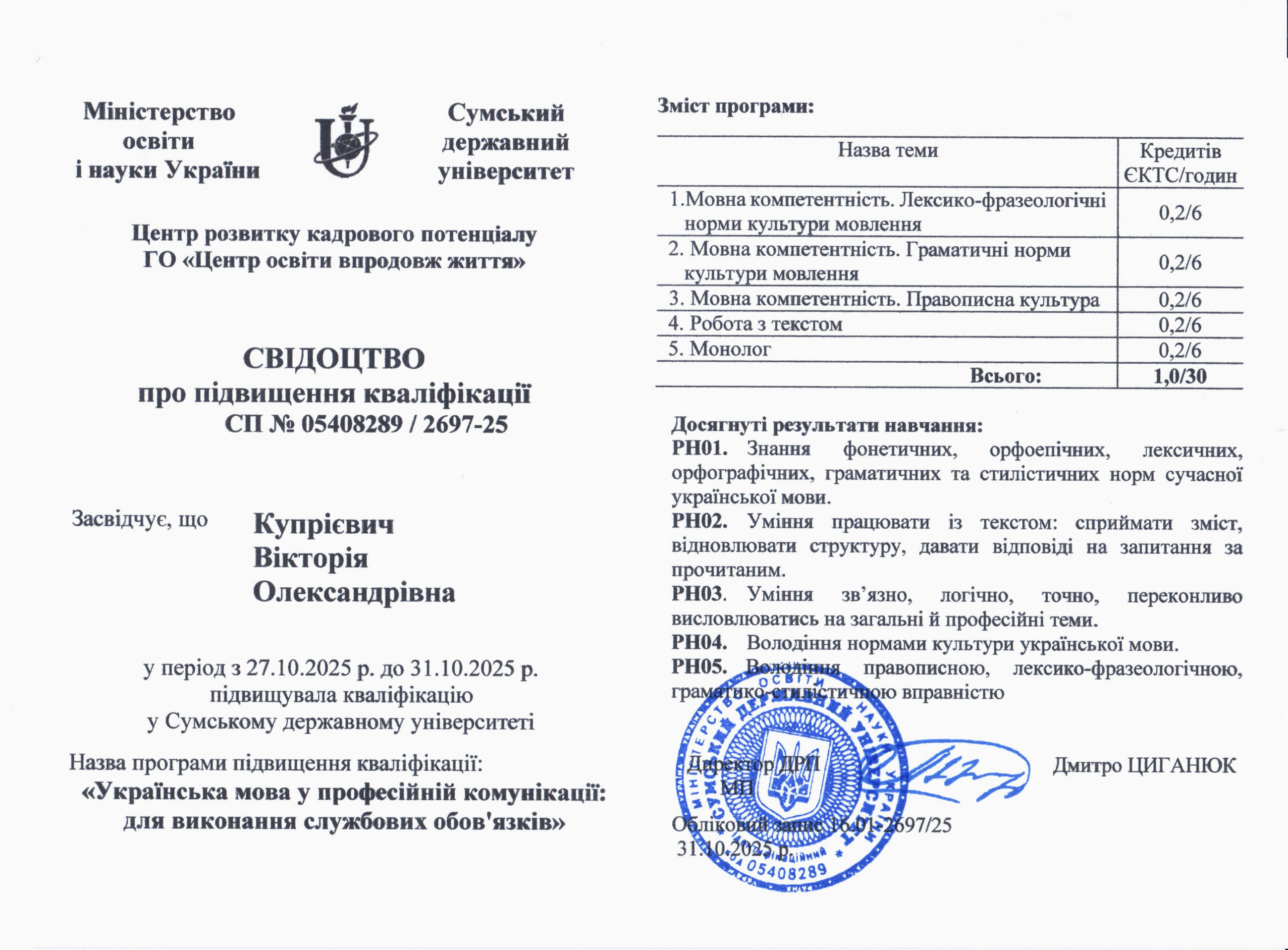 Сертифікат про підвищення кваліфікації за програмою "Українська мова у професійній комунікації: для виконання службових обов'язків" (Сумський державний університет, Центр розвитку кадрового потенціалу ГО "Центр освіти впродовж життя") (30 годин – 1 кредит ЭКТС), 31.10.2025 р.